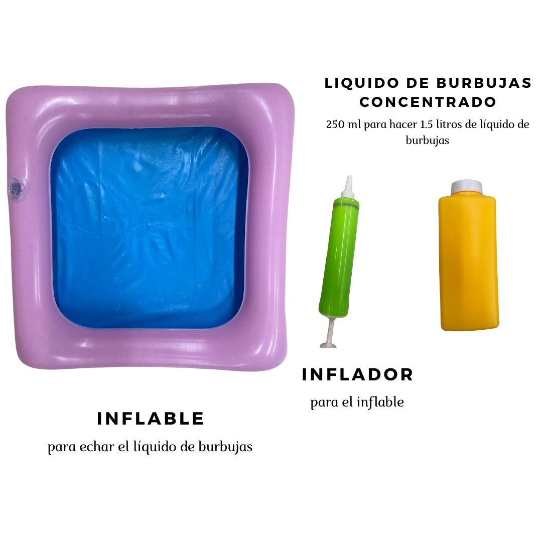 Si llevas nuestro kit este viene con todo lo que necesitas para la diversión: una varita en colores variados, un líquido concentrado para hacer burbujas (250ml / hace 1.5 litros), un inflable con la forma perfecta para echar el líquido de burbujas y su inflador.